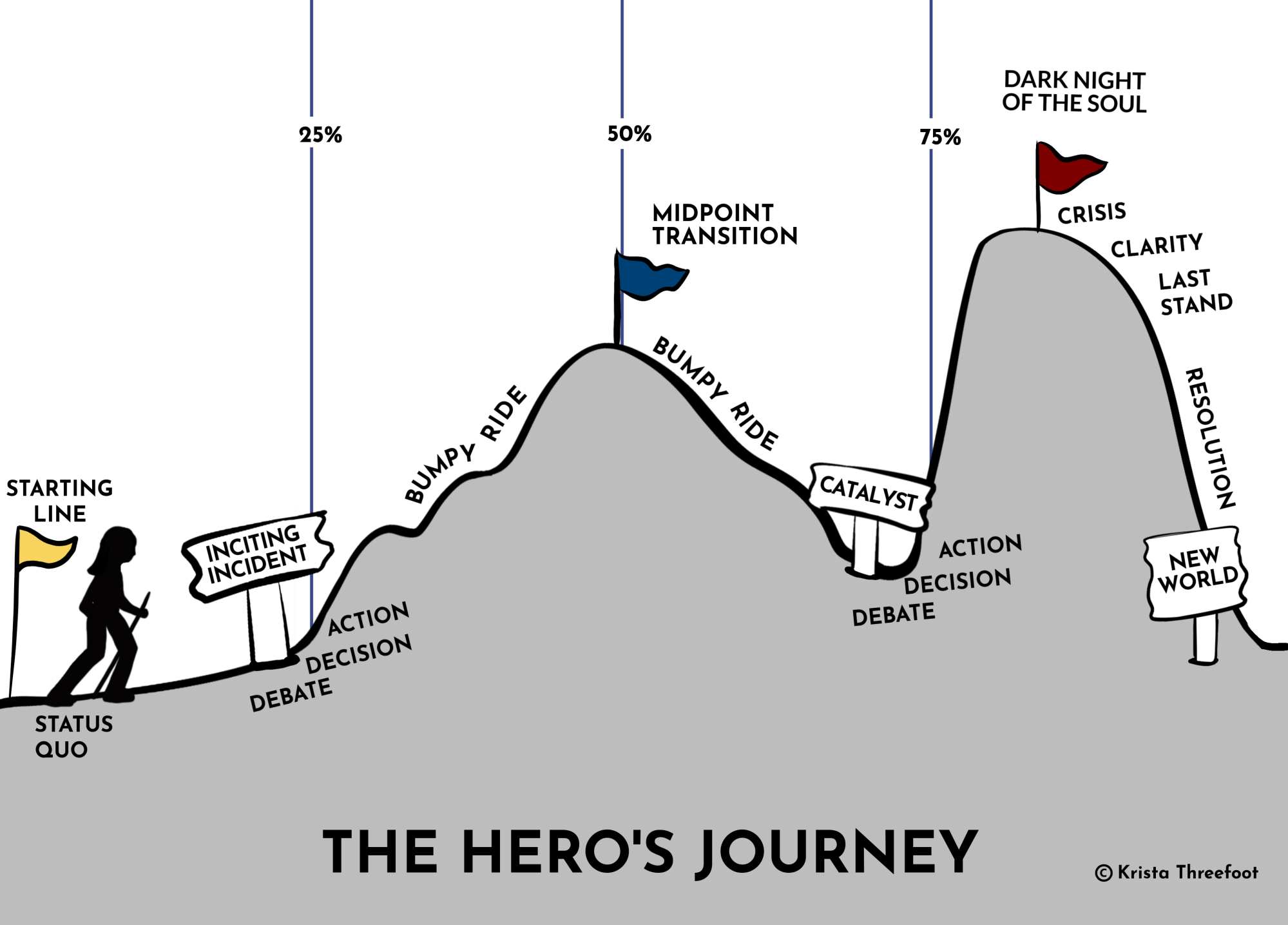 During the bumpy ride, our hero adjusts to their new reality, acting and reacting to the challenges and triumphs that guide both their external plot and internal growth.